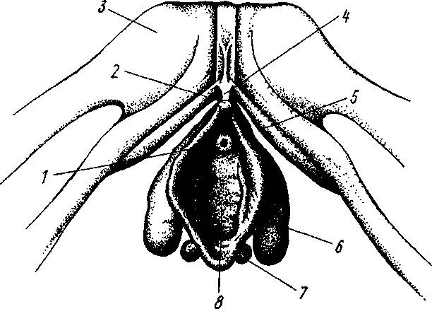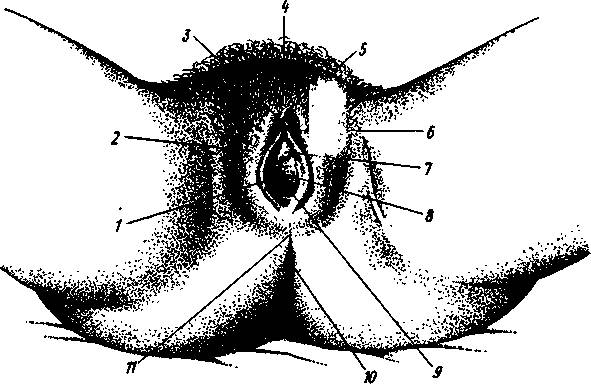 1 - наружное отверстие мочеиспускательного канала; 2 - головка клитора; 3 - лонная кость; 4 - тело