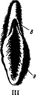 – увеличение головки клитора; 7 - увеличение объема малых половых губ, III - фаза плата; 8 -