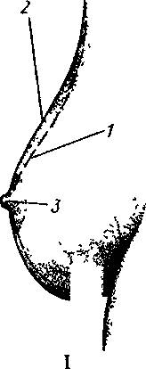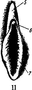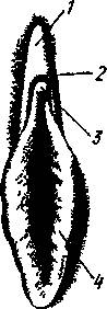 I - невозбужденное состояние: 1 - тело клитора, 2 - колпачок клитора; 3 - головка клитора; 4