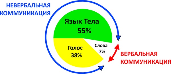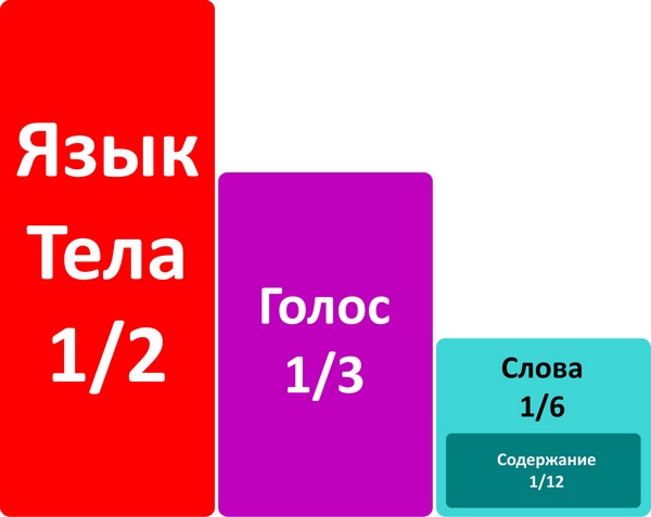 На диаграмме приведен анализ воздействия во время презентации [3] перед группой людей. При этом 55 % – это Язык Тела (позы, движе– ния, мимика), около 38 % – Голос (тон, интонации, ритм, тембр) и около 7 % – собственно Слова.