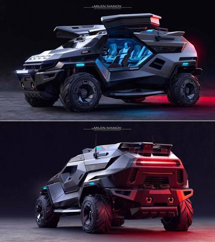 Внедорожник и вправду хорош. Выглядит непоколебимым, основательным и хорошо защищённым. Угловатая толстая броня. Единственная пара дверей, откидывающихся вверх. Шесть мест внутри просторного салона. Множество всевозможных индикаторов на голографическом интерфейсе приборной панели.