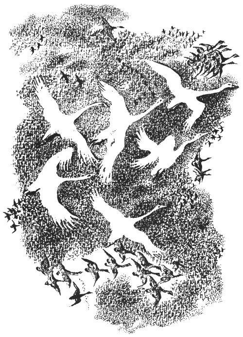 Тут и там в небе белые косяки: напряжённо вытянутые шеи, мерные взмахи крыльев.