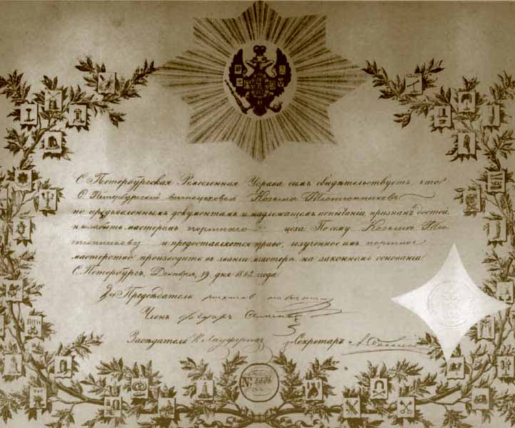 Свидетельство на звание портного, выданное Санкт-Петербургской ремесленной управой Козьме Афанасьевичу Тютюнникову (Тетерникову), отцу Федора Сологуба, 19 декабря 1862 г. ИРЛИ.