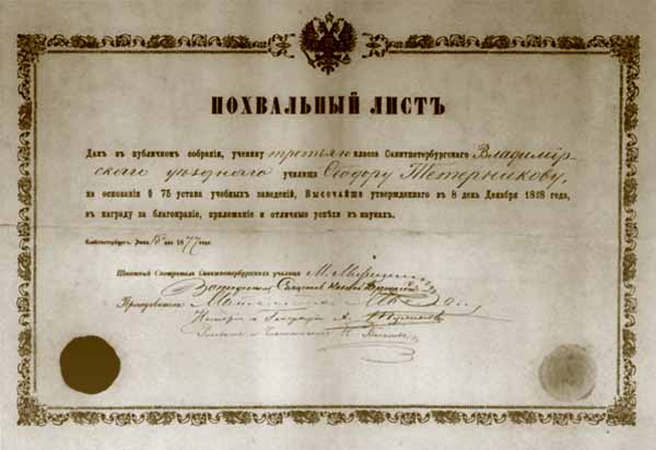 Похвальный лист, выданный Федору Тетерникову 15 июня 1877 г. Санкт-Петербург. ИРЛИ.