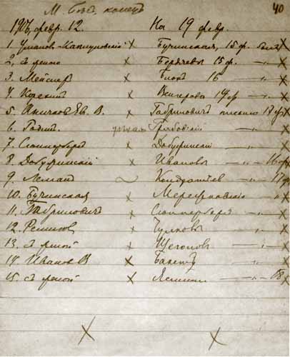 Приглашены на 19 февраля: Н. А. Бучинская (Тэффи), Н. А. и Л. Ю. Бердяевы, А. Блок, 3. А. Венгерова, Л. Е. Габрилович, В. М. Грибовский, М. В. Добужинский, Вяч. Иванов, Л. Д. Зиновьева-Аннибал, А. А. Кондратьев, Д. С. Мережковский, 3. Н. Гиппиус, К. А. Сюннерберг, Г. И. и Н. Г. Чулковы, Л. С. Бакст, И. И. Ясинский.