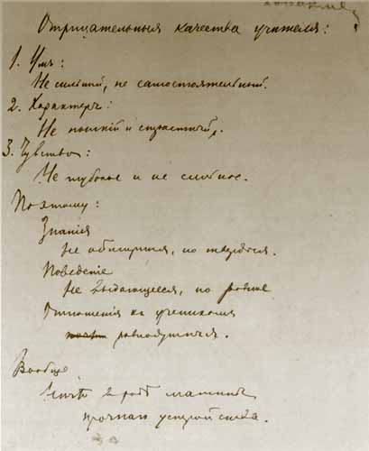Федор Сологуб. Фрагмент записи: «Отрицательные качества учителя». 1890 г. ИРЛИ.