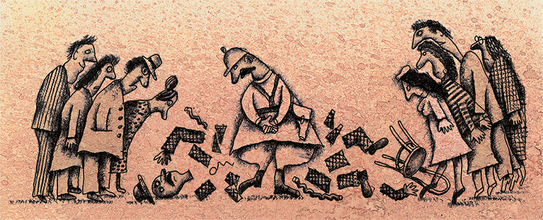 Тут выбежали жильцы и видя, что делает несчастный Петр Леонидович, накинулись на него и разодрали на нем жилетку.