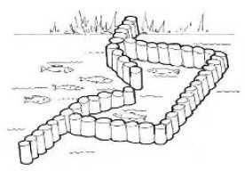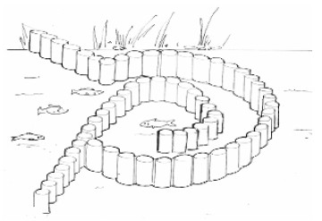 В малонаселенных северных и сибирских регионах картина несколько иная: сельские жители и по сей день продолжают активно ловить рыбу котцами. Например, в Ханты-Мансийском округе используют ловушки, изображенные на рис. 27. Устанавливаются котцы на неглубоких участках реки, материал – тонкие колышки, вколоченные в дно с зазором 1–1,5 см. Ловля производится в зимнее время (лед, намерзающий в центральной камере котца, регулярно удаляется). Основной улов составляют щуки, обычно некрупные.