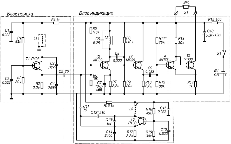 Питание металлоискателя повышенной чувствительности осуществляется от источника В1 напряжением 4,5 В. В качестве такого источника можно использовать, например, так называемую квадратную батарейку типа 3336Л или три элемента типа 316, 343, соединенные последовательно.
