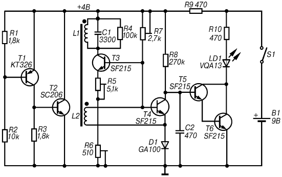 После того как вблизи поисковой катушки L1 окажется металлический предмет, ее индуктивность изменится. Это приведет к срыву колебаний ВЧ-генератора, что будет сразу зарегистрировано транзистором Т4, который закроется. При этом транзисторы Т5 и Т6 откроются, а светодиод LD1 начнет светиться.