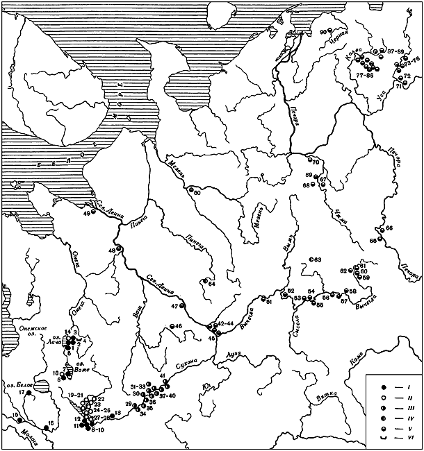 1 — Нижнее Веретье I; 2 — Нижнее Веретье; 3 — Попово; 4 — Попово (могильник); 5 — Сухое; 6 — Погостище; 7 — Мыс Вязовый; 8 — Шуйское, р. Вологда; 9 — Канифольный; 10 — Лиминская; 11 — Вологда. Дворец пионеров; 12 — Прилуки; 13 — Шуйское; 14 — Малый Колокол; 15 — Чагодоща; 16 — Ягорба; 17 — Андозеро-М; 18 — Погостище; 19 — Устье; 20 — Данилиха; 21 — Площадка; 22 — Бор I; 23 — Бор; 24 — Чернышево; 25 — Лысая Гора; 26 — Пахотино; 27 — Шлюз; 28 — Шачино; 29 — Яснополянская; 30 — Песьеденга; 31 — Еденга I; 32 — Еденга; 33 — Карьер; 34 — Красное; 35 — Любавчихская; 36 — против устья р. Царевы; 37 — Неклюдовская; 38 — Колупаевская 2; 39 — Колупаевская; 40 — Тихоновская; 41 — Коченьга; 42 — Фпличаевская II; 43 — Филичаевская III; 44 — Филичаевская IV; 45 — Вондонга I; 46 — Кадыевская; 47 — Приозерная 4; 48 — Усть-Обокша; 49 — Риквасиха; 50 — Лешуконское; 51 — Межог; 52 — Полевица II; 53 — Курьядор; 54 — Пезмог I; 55 — Нидз I; 56 — Аныб I; 57 — Аныб II; 58 — Ульяновская; 59 — Пожег; 60 — Ягкодж III; 61 — Кузьвомын; 62 — Воль I; 63 — Вис I; 64 — Явроньга I; 65 — Заречная; 66 — Петрушинская; 67 — Турун-Нюр I; 68 — Кельчиюр I; 69 — Лек-Леса I; 70 — Лек-Леса II; 71 — Пдакская; 72 — Адзвинская; 73 — Адзьва 13; 74 — Адзьва 19; 76 — Адзьва 42; 77 — Сандибейю I; 78–86 — Сандибейю; 87 — Колва-Вис 13; 88 — Колва-Вис 14; 89 — Колва-Вис 16; 90 — Черная I.
