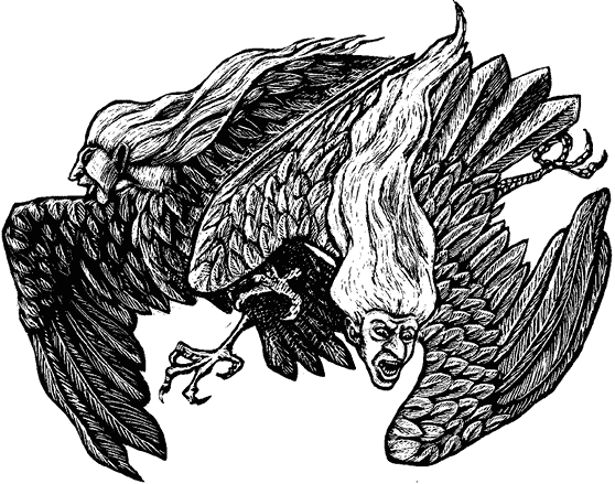 В числе множества сказочных животных Греции были и ужасные гарпии. Их общее число никогда не было точно известно. Название «гарпии», возможно, происходит от греческого harpyiai, что означает «хвататели» или «похитители». Это были огромные хищные птицы, имевшие тела грифонов, головы и лица женщин, и когти орлов. Если верить некоторым источникам, их крылья были из металла и во время полета издавали ужасный лязгающий звук.
