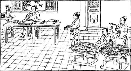 На рисунке показан процесс набора с помощью подвижного деревянного шрифта, разработанный Ван Чэнем в конце XIII в., 250 лет спустя после изобретения подвижного шрифта Би Шэном. Справа: вращающиеся кассы, позволявшие наборщику быстрее находить нужные знаки. Слева: работник разглаживает обратную сторону листа бумаги, чтобы получить оттиск с печатного блока.