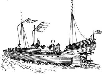 Реконструкция китайского военного колесного корабля (около 1135 г.н. э.) Вероятно, это был крупнейший представитель своего класса, с двадцатью двумя гребными и одним кормовым колесом. Кроме судовой команды, на нем размещалось около 3000 морских пехотинцев.