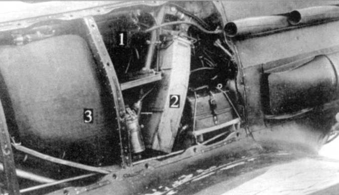 МиГ-3 крупным планом. 1. Маслобак. 2. Патронный ящик. 3. Бензобак емкостью 110 л.