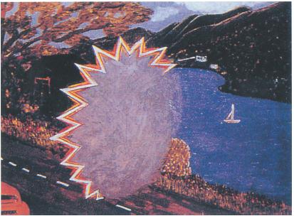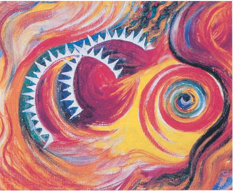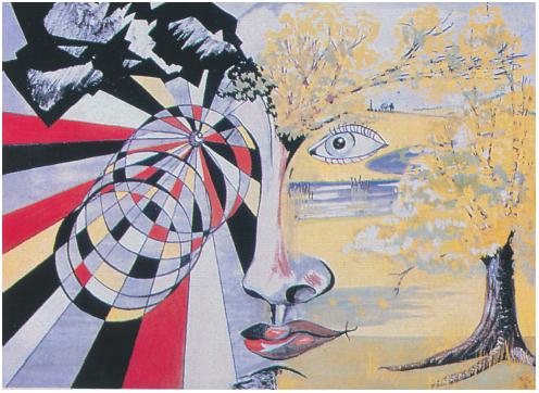 Рис. 2Б. Половину этого изображения занимает геометрическая галлюцинация, состоящая исключительно из радиальных форм с цветными спицами-лучами, спиралями или завитками. Над ними видны фрагменты с острыми краями. Правая половина рисунка абсолютно реалистична.