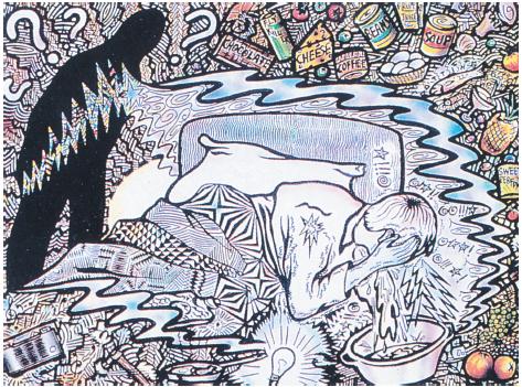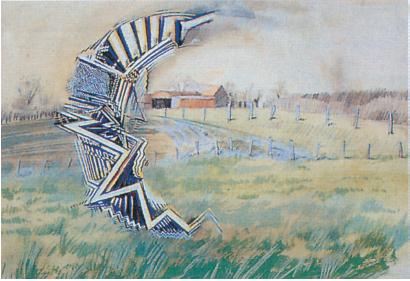 Рис. 4А. На этом рисунке больной мигренью изобразил себя. Его рвет в мир, состоящий из фортификационных призраков, решеток, водоворотов и зигзагов, заполнивших все поле зрения. Сверху над сценой нависает темный силуэт – фантомный образ.