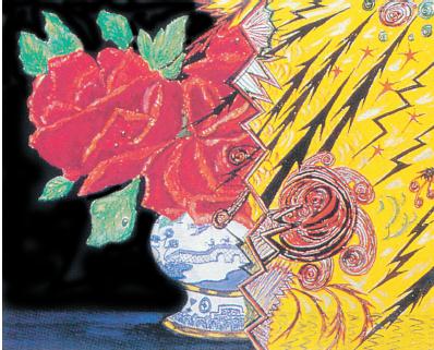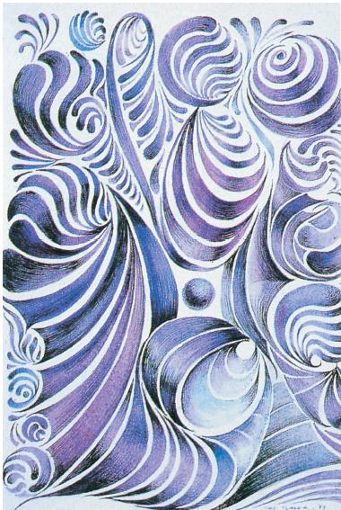 Рис. 2А. На этом натюрморте, изображающем букет роз, половина полотна замещена мигренозной скотомой – зигзагами, звездочками и завитками. Последние имеют вид концентрических окружностей и спиралей. Вторая половина рисунка абсолютно реалистична.