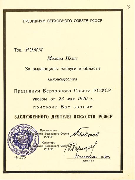 Почетная грамота, врученная Президиумом Верховного Совета РСФСР М. И. Ромму «за выдающиеся заслуги в области киноискусства»