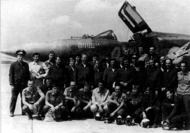 Летчики 190 иап после возвращений из ДРА, аэродром Канатово. 11 августа 1987 г. Крайний слева – майор А. Ббольшаков. На заднем плане МиГ-23МЛД № 47. Из архива С. Пазынича