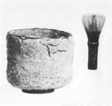 Современная чашка, выполненная в традиционной манере, особое очарование которой придают чуть неправильная форма и трещины на поверхности, а также веничек, выполненный из цельного куска бамбука, для перемешивания измельченного в порошок зеленого чая.