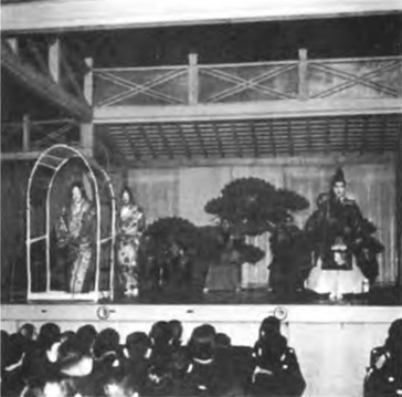 Сцена из драмы Но. На заднем плане изображена темно-зеленая сосна, традиционный символ силы и долголетия.