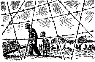 А между морем и зарослями раскинулся лагерь для военнопленных. Серые бараки приникли к земле, обнесенные тронным рядом колючей проволоки. Именно они, надо думать, определяли характер пейзажа. Горе, тоска, страх легли на мох и заросли, как ложится серая придорожная пыль.