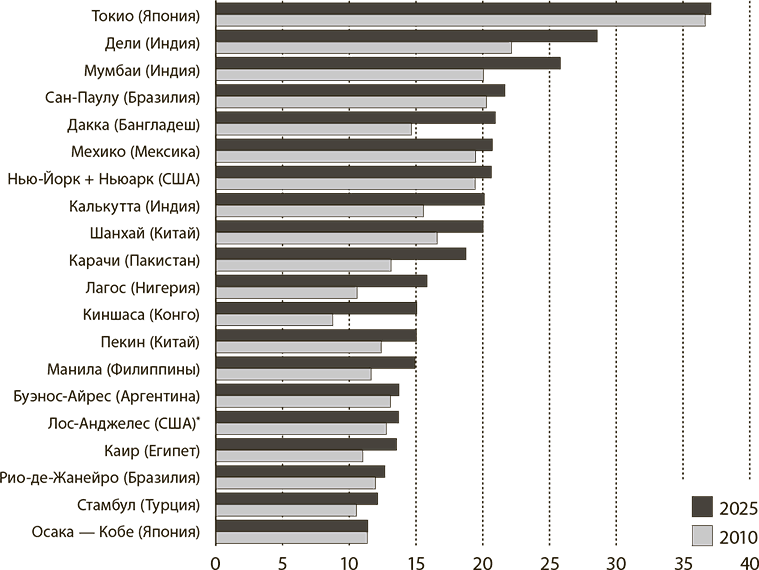 Постаревшее, увеличившееся население планеты станет более урбанизированным (см. рис. 1.3). В 2010 г. половина людей на Земле проживала в городах. К 2050 г. доля городского населения приблизится к 70 % – это около 6,5 млрд человек, то есть столько, сколько составляло население всего земного шара в 2005 г. Уже к 2025 г., вероятно, появится 30 мегаполисов с численностью населения в 10 и более млн человек в каждом (в 1950 г. таких было всего два – мегаполис Нью-Йорк – Ньюарк и Токио, см. рис. 1.4). При этом самый быстрый прирост возможен в городах с населением в 10 млн человек и менее. Консалтинговое агентство McKinsey называет в своих отчетах более 400 активно растущих городов в развивающихся странах.