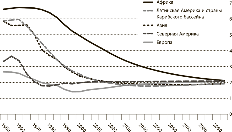 Вследствие демографической инерции количество «дополнительных» людей в мире после 1965–1970 гг. продолжало расти еще в течение двух десятилетий, достигнув пика в конце 1980-х гг., когда общая численность населения ежегодно возрастала почти на 90 млн человек. Темп роста оставался относительно высоким и после 1970 г. Он резко упал только в 1990-х гг., когда, наконец, стало ощущаться влияние низкой рождаемости. Ежегодный прирост, равный почти 78 млн человек в 2010–2015 гг., в конце 2030-х гг. понизится до 52 млн, до 30 млн в середине 2050-х гг. и составит всего треть прироста конца 1980-х гг. К этому времени скорость ежегодного прироста населения в мире впервые с начала XIX в. опустится ниже 0,5 %. Непрекращающийся гигантский рост, начавшийся в Европе с промышленной революцией и охвативший все уголки мира, закончится.