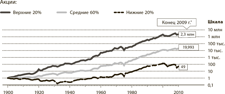 Совокупный эффект этой тенденции оказывается достаточно поразительным. Элрой Димсон, Пол Марш и Майк Стоутон из Лондонской школы бизнеса изучили динамику цен на 100 крупнейших акций на британском рынке за период с 1900 г. Они рассчитали совокупный возврат на инвестиции при покупке 20 акций, показавших наилучшие значения за предыдущие 12 месяцев, и ежемесячном изменении состава портфеля. Такая стратегия инвестирования могла превратить 1 фунт стерлингов в 1990 г. в 2,3 млн фунтов стерлингов к концу 2009 г. Та же сумма, инвестированная в акции с худшими результатами за последние 12 месяцев, превратилась бы к 2009 г. всего в 49 фунтов стерлингов (см. рис. 15.3).