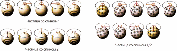 Чем больше спин, тем меньшая доля оборота нужна, чтобы частица в результате осталась неизменной. Но удивительно, что существуют частицы, которые остаются неизменными только после двух полных оборотов. О таких говорят, что они имеют спин 1/2.