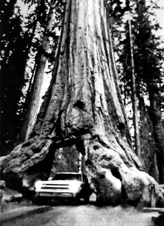 О мощи секвой можно судить по этому снимку тоннеля в основании дерева (через него проходит автодорога) и по этому любопытному факту. «На пне спиленного дерева была устроена площадка для танцев. На ней поместился оркестр из четырех человек, шестнадцать пар танцевали, и тут же стояло двенадцать человек зрителей». В долбленых дуплах секвой предприимчивые люди устроили в свое время сувенирные лавки. Вот вывеска над одной из «торговых точек»: «Верите или нет, но это известное в мире Дерево-Дом». Хозяин лавки со своей маленькой суетой выглядит бабочкой-однодневкой, присевшей у ног великана. Однако, как видим, «бабочка» вовсе не безобидна — дупло, танцплощадка, тоннель… К счастью, люди опомнились.