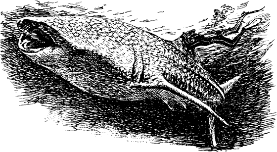 Китовая акула, несомненно, самая крупная рыба в мире. Она достигает в длину двадцати с лишним метров, а десятиметровые экземпляры вполне обычны. Люди редко наблюдали этого исполина, и нам не известно, мигрирует ли китовая акула, подчиняясь каким-то своим закономерностям, или ведет оседлый образ жизни. Питается она, как киты, планктоном и мелкой рыбешкой: вполне возможно, что это заставляет акулу держаться глубоководных океанских течений, в которых сосредоточен ее корм. За все годы, проведенные в море моим отцом, он только дважды видел это могучее животное.