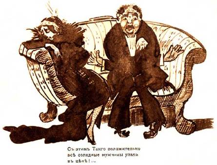 Никаких дансингов и танцплощадок не было. Танцевали только на вечерах и балах. В 1912 году в моду вошел танец танго, но исполнялся он преимущественно на эстрадах или особенно квалифицированными любителями. Последнее па заканчивалось отчаянным перегибом дамы и наклонившимся над ней партнером, поддерживающим даму за талию. Появился даже модный желтозолотистый цвет шелковистых тканей, называемый «танго».