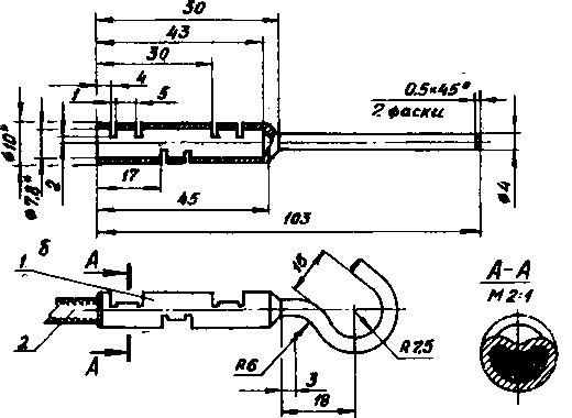 Чтобы в дальнем путешествии сделать «крепление багажа на мотоцикле надежным и удобным, рекомендуем применять специально подготовленные резинки различной ширины и длины. Для этой цели используются, например, резинки плечевого эспандера, которые можно приобрести в магазинах спортивных товаров. Чтобы обеспечить захват багажника такими резинками, зацепы их проволочных наконечников следует развернуть приблизительно на 90° и несколько отогнуть. Если будет использована иная многожильная резина круглого сечения с матерчатой оплеткой, для облегчения захвата ею багажника рекомендуем снабдить ее специальным наконечником, конструкция которого представлена на рис. 74. Для соединения с резинкой ее конец следует ровно обрезать ножом, вставить в отверстие наконечника