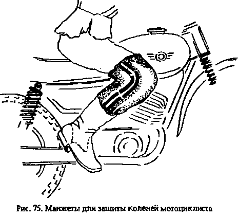 При движении на мотоцикле в дождь или в холодную погоду рекомендуем использовать специальные защитные манжеты, которые защитят колени от намокания или переохлаждения, а также предотвратят попадание воды в сапоги через верх голенищ. Такие манжеты надеваются на дорожный костюм при ухудшении метеорологических условий. Защитные манжеты (см. рис. 75) могут иметь три слоя: наружный — плотный материал типа палаточной ткани, тонкого брезента или искусственной кожи на трикотажной основе, средний — полиэтиленовая пленка толщиной 0,2–0,3 мм, внутренний — тонкая хлопчатобумажная ткань. Из упомянутых материалов выкраиваются куски соответствующих размеров, накладываются друг на друга и предварительно простегиваются капроновыми нитками. Затем противоположные кромки заготовки сшиваются так, чтобы получилась многослойная манжета, представляющая собой усеченный конус с окружностью внизу диаметром 18–20 см, вверху — 15–17 см и высотой 40–50 см. В закладки, выполненные в верхней и в нижней части, втяните резинки, которые должны охватывать ногу выше колена и голенище сапога. При желании манжету можно несколько видоизменить, например, выполнив заднюю часть ее одинарной, что значительно улучшит эластичность, а манжеты из искусственной кожи не требуют промежуточного и подкладочного слоя. Творческий подход к выбору цвета материала манжет и умелое использование декоративных элементов (например, горизонтальных или вертикальных полосок) позволят создать оригинальный элемент дорожной одежды, хорошо