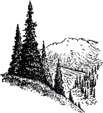 Сверху совсем крошечными кажутся две палатки нашего бивака и как точечки — люди. Отсюда на горизонте видны угрюмые скалистые вершины, покрытые ледниками, пониже их — каменистые осыпи, чахлая, едва приметная зелень, перемежающаяся с серыми камнями, потом отдельные кустики арчи и редкие, почти темно-синие столбики ели — деревья, забравшиеся выше всех к горному северу. Книзу елочки становятся чаще, а там по склону уже растет густой еловый лес.