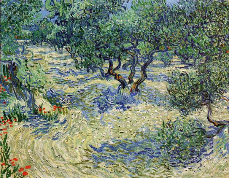 В оливах живописца привлекала густая фиолетовая тень, которую они давали земле от жаркого прованского солнца. Монотонные мазки создают декоративный ритм, напоминая годовые кольца древесины. Картина становится символом жажды жизни, тихим изумлением художника перед красотой и богатством окружающего мира.