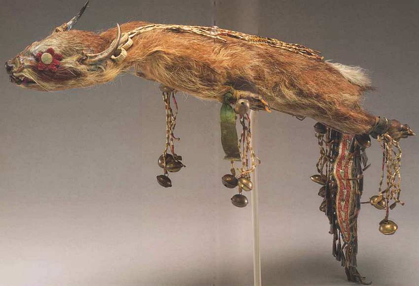 Этот необычный артефакт принадлежит культуре американских индейцев, населявших прерии (степи). Их предметы быта очень затейливо декорированы, украшения имели двоякую функцию. Чучело убитого зверя свидетельствовало о хороших охотничьих способностях его владельца, а также служило оберегом от злых духов. Такие сумки из животных были чрезвычайно распространены. Данный экспонат интересен своим возрастом и богатством отделки. Шкурки оформлялись сплетениями из перьев, обшивались бисером, бусами, раскрашивались, а также дополнялись различными аппликациями из лоскутков материи. Все средства украшения подчеркивали основные черты животного, тело будто становилось скульптурой, идолом, которого можно носить с собой. Скорее всего, это черноногий хорек, названный вид водился в американских степях. К голове зверька прикреплены когти орла. Они призваны олицетворять священную для индейцев силу. Такие предметы — доказательства оригинальной культуры аборигенов Америки, с началом колонизаторства европейцев оказавшейся на грани исчезновения. Современные американцы, осознав урон, нанесенный в XIX веке самобытной цивилизации, стремятся сохранить для потомков оставшиеся произведения и свидетельства жизни племен.