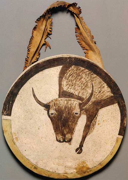 Данный экспонат относится к культуре арикара — так назывались индейские племена на территории Северной Дакоты. Декоративный щит являлся оберегом. На натянутой бычьей коже изображен буйвол. Этот рисунок создан во время экстатического транса индейского шамана. Праздники индейцев представляли собой череду сложных ритуалов, которые проводились на протяжении нескольких дней ради общения с богами и духами степи. Люди пели, исполняли танцы, рассказывали легенды, вводили себя в состояние гипноза и визионерствовали (вызывали духов и разговаривали с ними). Интересна композиция произведения: животное нарисовано появляющимся издалека, откуда-то сбоку, бык словно выплывает из подсознания.