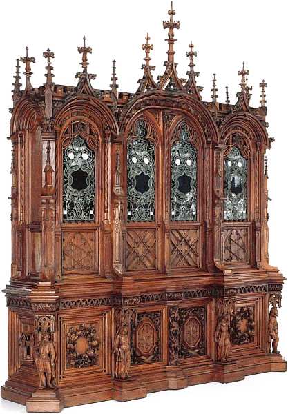 В 1851 произошло событие, которое еще несколько десятилетий имело непосредственное влияние на художественную жизнь по всему миру. Им стала Всемирная выставка в Лондоне. Она привлекла лучшие творческие силы Европы, позволила специалистам и художникам наметить основные проблемы в области дизайна и пути к их решению. Стало очевидно, что качество изделий для быта, их художественную ценность можно повысить. Американские творцы и ремесленники были вдохновлены и уже спустя два года, в 1853, открыли похожую выставку в Нью-Йорке. Этот шкаф в неоготическом стиле явился одной из изюминок экспозиции. Резные арки, ниши, башенки, фигуры вторили великим соборам Средневековья.