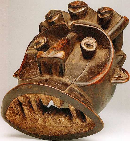 Все произведения африканцев посвящены исконным верованиям. Песни, пляски, рассказы о прошлом, костюмированные представления являлись частью религиозной практики. Эта маска — украшение головы — неотъемлемый элемент подобного празднества. На ней изображено существо — полуобезьяна-получеловек, олицетворяющее клан правителей народности. На голове у него — три хамелеона, которые символизируют мистические сверхспособности правителя. Художественный язык пластики, вдохновленный верой, строится, как обычно для африканского искусства, на синтезе реалистических деталей в изображении человека и животного и концептуальной композиции, основанной на выразительности простых геометрических форм.