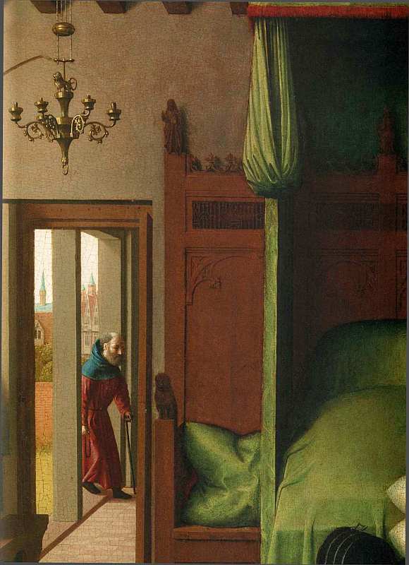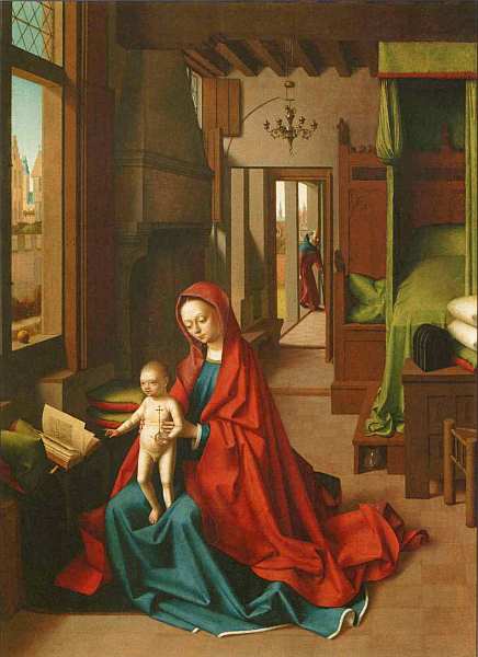 Данная работа является одним из самых важных и ценных экспонатов коллекции канзасского музея. Она прекрасно демонстрирует лучшие черты искусства Северного Ренессанса: математически рассчитанную перспективу, внимание к каждой, казалось бы, второстепенной, бытовой детали. Так, религиозная по сюжету картина (традиционный образ Богоматери с Младенцем) превращается в почти жанровую сцену. Перед зрителем — наполненный особой молитвенной тишиной и покоем уютный дом. Свет из окна, в котором виден реальный пейзаж города Брюгге, мягко обволакивает пространство интерьера. Искусство Северной Европы воспевало поэзию домашнего мира, который становится целой Вселенной. Петрус Кристус был одним из учеников великого Яна ван Эйка, фламандского живописца первой половины XV века.