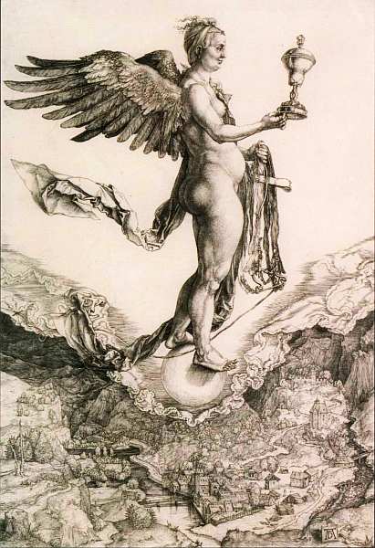 В этой гравюре великий немецкий художник Северного Ренессанса Альбрехт Дюрер соединил в образе крылатой женщины сразу двух богинь — Немезиду, древнегреческую богиню возмездия, и Фортуну, древнеримскую покровительницу удачи и побед. Он мастерски задает загадку своим зрителям, остроумно совмещает во многом противоположные