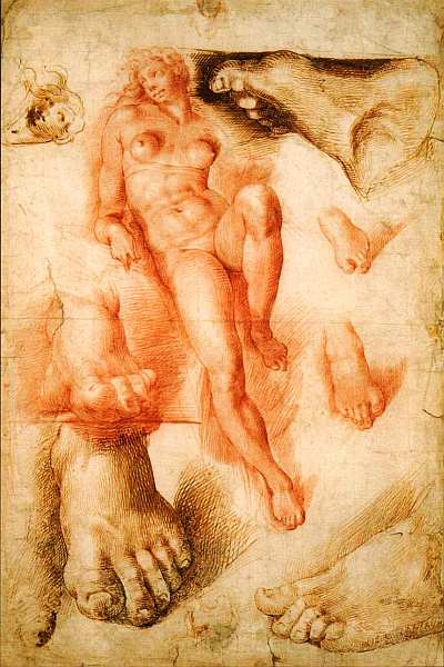 На этом листе Бартоломео Пассаротти выполнил рисунок статуи «Аврора» Микеланджело. Скульптура украшает одно из самых знаменитых творений мастера — надгробие Лоренцо Медичи в церкви Сан-Лоренцо во Флоренции. Самостоятельная работа по копированию шедевров — и сегодня важнейшая часть обучения художников. Пассаротти был представителем болонского маньеризма. Данное направление вопреки своему названию, которое сейчас звучит как «манерность», включает произведения мистического содержания. Краски на картинах маньеристов словно плавятся от духовного жара, фигуры вытянуты, лица болезненны, они символизируют триумф души над бренным телом. Микеланджело состоял в числе кумиров маньеристов из-за особого «титанического» характера его персонажей.
