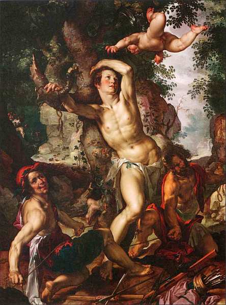 Иоахим Эйтевал, известный нидерландский творец первой половины XVII века, использовал сложные, даже неожиданные ракурсы персонажей. Данная работа также относится к стилю маньеризм. В ней самое главное — сочетание виртуозной техники с религиозным сюжетом, который словно «оправдывает» доведенную до щегольства техничность исполнения. Страстный порыв духа святого Себастьяна конгениален стремлению мастера, вложившего все свое умение в живописное произведение. Святой был римским легионером, он пострадал за веру во время гонений на христиан.