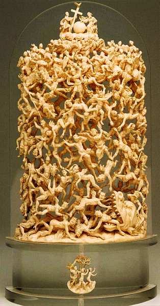 Перед зрителем — ни с чем не сравнимый предмет жанра кабинетной скульптуры. Шедевр резьбы по слоновой кости изображает монументальную сцену падения ангелов. Фактически, это точная иллюстрация из Откровения Иоанна Богослова: «И услышал я громкий голос, говорящий на небе: ныне настало спасение и сила и царство Бога нашего и власть Христа Его, потому что низвержен клеветник братий наших, клеветавший на них пред Богом нашим день и ночь». Сложность композиции, виртуозность выделки, а также сам сюжет ярко характеризуют религиозное и светское искусство маньеризма и рококо. Техническое совершенство данной небольшой вещицы потрясает воображение, требуется много времени, чтобы рассмотреть все фигурки ангелов и демонов.