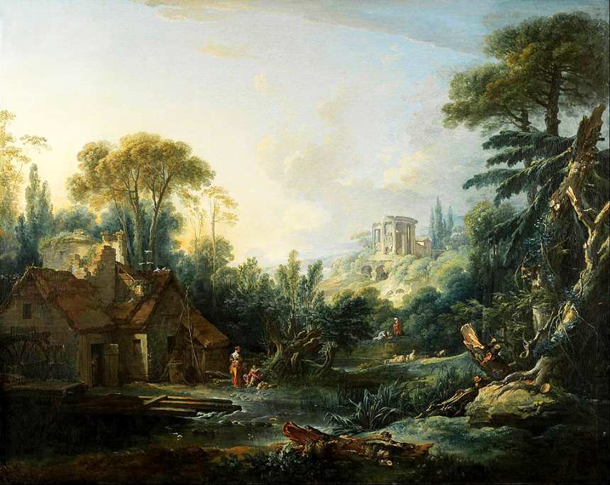 Полотно Буше написано по мотивам произведения другого французского классика, мастера пейзажа, который работал на век раньше, — Клода Лоррена. Это пасторальная картина: художник изображает мирную сельскую жизнь и труд крестьян. Он помещает персонажей в пышную, щедрую зелень Франции. Лучи солнца озаряют уголок теплым светом, кажется, что представлен затерянный рай. Об уединенности свидетельствуют и живописные руины ротонды. Образованный зритель того времени (а такие холсты могли себе позволить только высшие слои общества) сразу узнал бы в этой колоннаде античный храм Сивиллы в Тиволи. Названное здание очень любил изображать на своих полотнах и Лоррен. На первый взгляд кажется, что это простой, хотя и виртуозно написанный пейзаж, что у него нет темы. Однако отсылки к другому художнику, введение дополнительных символов, вкупе с мастерски