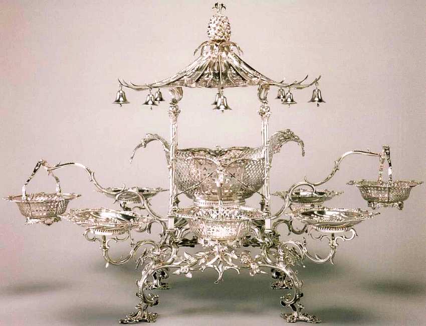 Эпернь — многоярусная ваза, которую традиционно устанавливали на середину стола в аристократических домах. Обычно это был центральный сосуд, к нему прикреплялись несколько дополнительных чаш и блюд для фруктов и сладостей. Данный экспонат — один из самых сложных и виртуозных по исполнению столовых приборов указанного вида. Он сделан из серебра Томасом Питтсом. Мастер специализировался на столовых приборах нового вида: усложненные конструкции были придуманы для облегчения обеденных ритуалов. Гости сами могли брать понравившиеся им блюда, а не ждать слуг, которые вереницей подносили яства. Эта эпернь дает возможность познакомиться с особенностями стиля рококо в декоративно-прикладном искусстве. Привлекает внимание изысканность деталей: сложные профили ножек, узоры из экзотических цветов. Верхняя часть прибора напоминает пагоду. Такой, казалось бы, неожиданный образ появился в оформлении эперни неслучайно. Именно в XIX веке европейцы открыли для себя таинственное искусство Востока. Гостиные знати наводнили японские и китайские мотивы декора. Так произошел синтез двух культур: сложные изящные линии и завитки рококо объединили в себе наследие барокко и дальневосточных орнаментов.