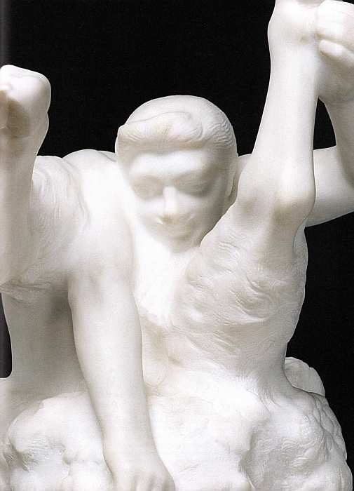 Так и в этом творении ваятель изображает юношу, который олицетворяет ураган, бурю, грозу — неподвластные человеку, свирепые силы природы. Привлекает внимание то, как слоистая структура мрамора эффектно выделяется благодаря вырезанной копне волос персонажа.